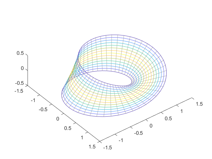 mobius=@(t,phi) [(1+t/2*cos(phi/2)).*cos(phi); (1+t/2*cos(phi/2)).*sin(phi); t/2*sin(phi/2)];